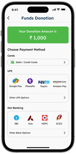 Donors can choose preset donation amounts or enter a custom amount. The platform also collects personal details for cases where donations are made on behalf of others.